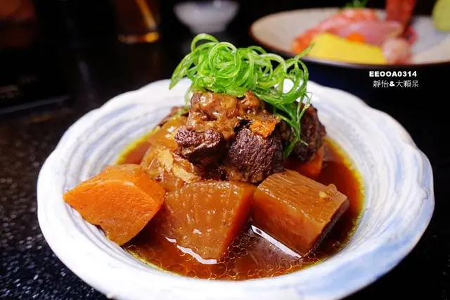 當天的開胃前菜有燉牛頰及刺身,我們就各來一份,前菜的份量也不少,刺身會依照當日的魚貨而有所不同,當天吃到鮭魚、紅甘及甜蝦,另外還有一塊玉子,芥末為新鮮現磨的,香氣足不刺鼻
