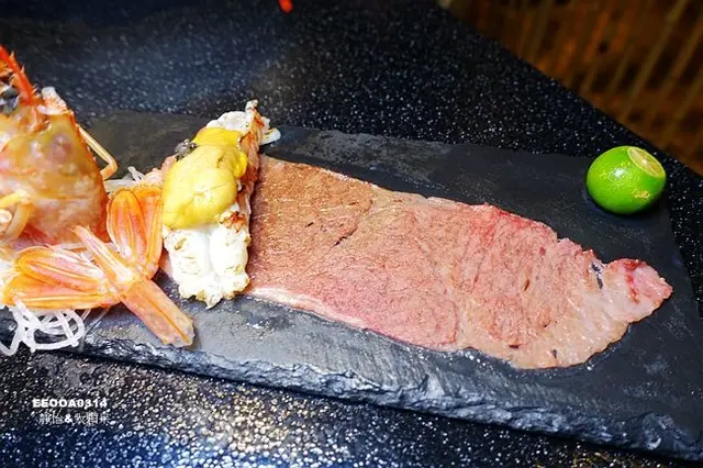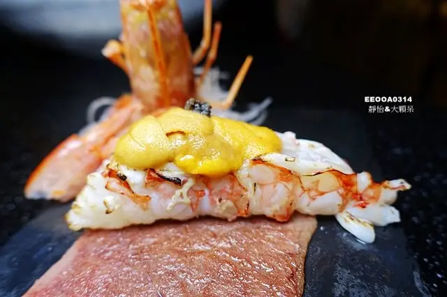 這道是單點,最新鮮的食材組合在一起,成了最美味的餐點,一大片的和牛與肥美甜蝦、黃橙橙海膽,上面還有松露點綴,一口放進嘴裡,OMG~真是太邪惡太過癮了,也只有親口品嚐才知道箇中滋味