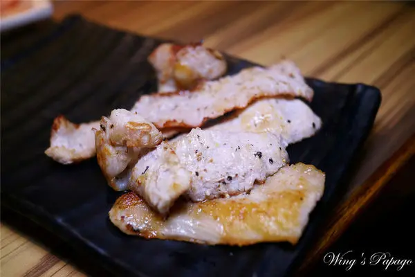 燒烤至半生熟,嚐來鮮嫩可口,愈嚼愈能感受油脂香氣。