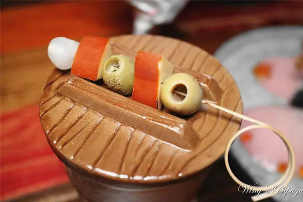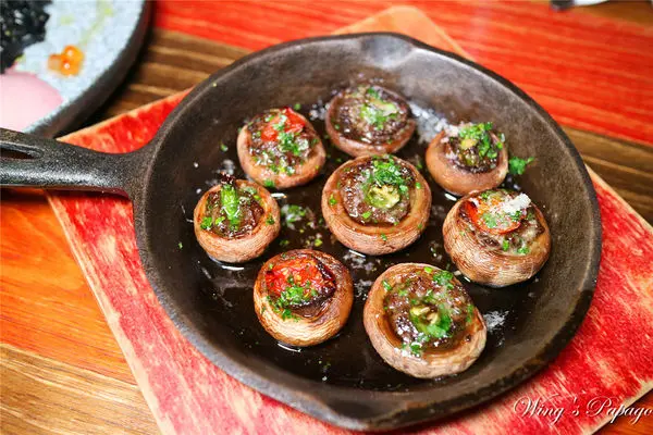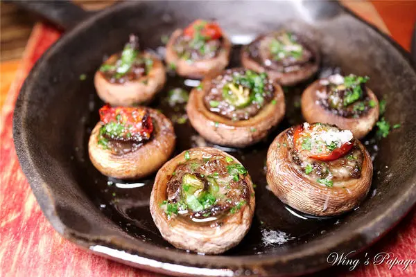 將蘑菇去蒂加入香料及蔬食放入小鐵鍋烘烤,上桌前會再淋上酒點燃營造視覺效果。
