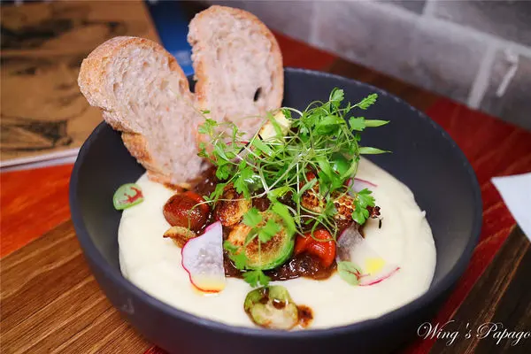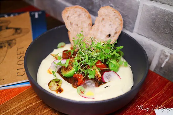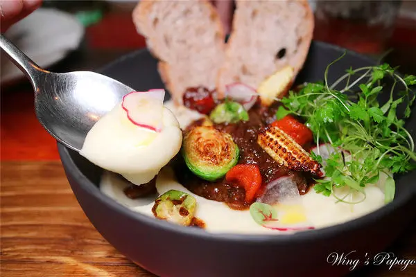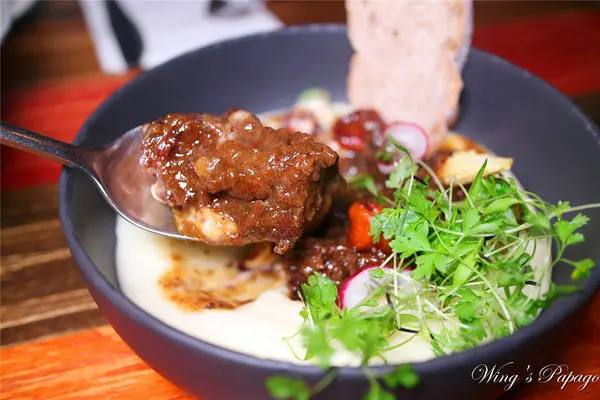 使用牛臉頰肉搭配七種辛香料及紅酒燉煮,佐底下的松露薯泥及蔬菜、麵包片食用。