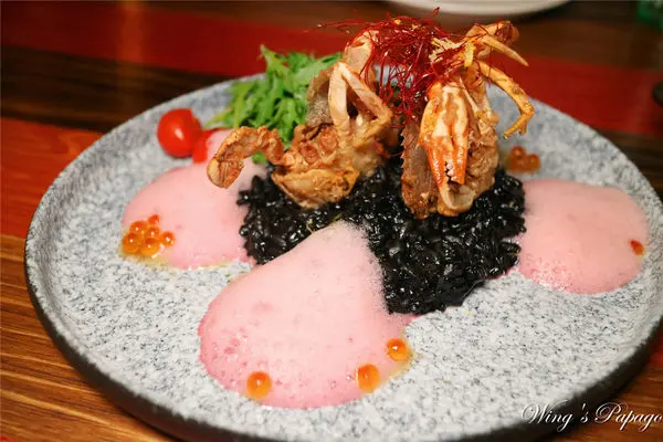 這道墨汁燉飯雖然黑嘛嘛的,但配上酥炸軟殼蟹、粉色泡沫、晶瑩鮭魚卵及紅辣椒絲,