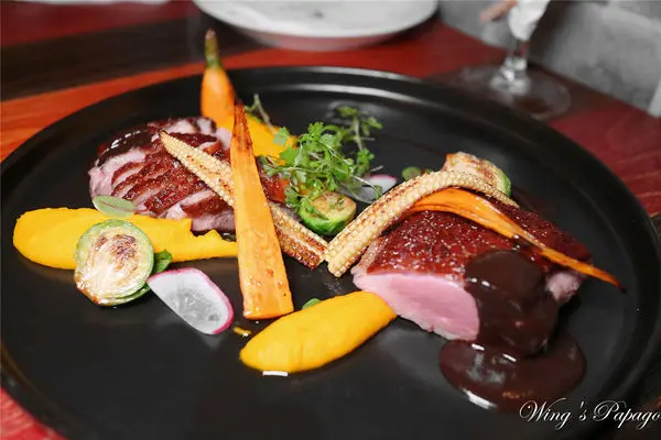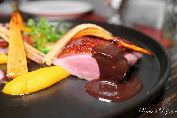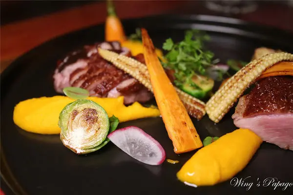 五分熟油封鴨胸,以辣巧克力醬及芒果調味,搭配南瓜泥及甜椒、玉米筍等蔬菜。