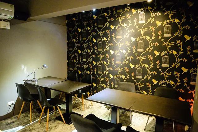 店裡有四張巴台桌,用墨鏡,木材,和印花玻璃做成,非常有質感這面金色的蜂鳥壁紙也是老闆之選一樓還有一個大書櫃,裡面放滿了設計雜誌與一些老闆的收藏品