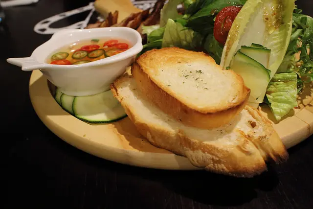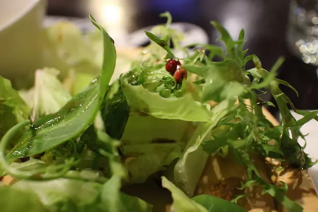 ◎新鮮花椒佐油醋生菜沙拉,花椒味道辛而暖,配上生菜頗契合。(旁有自製凱蕯醬可以蘸)