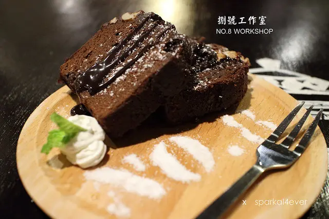 ◎「布朗尼」磅蛋糕般的質感,巧克力不甜,上頭淋醬也不會很甜,卻增添了層次,有微熱更微加幸福。
