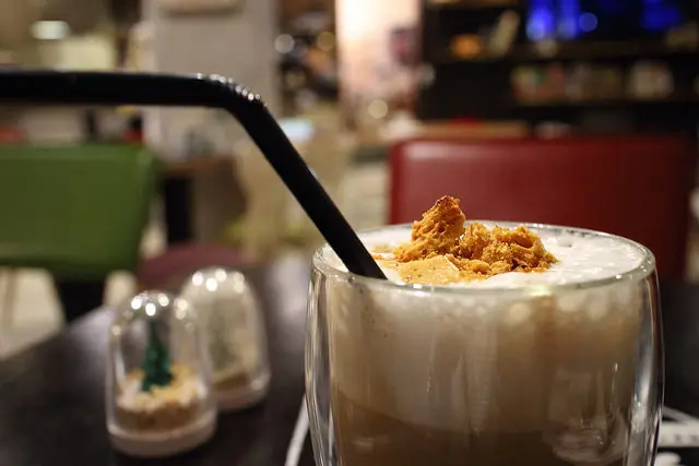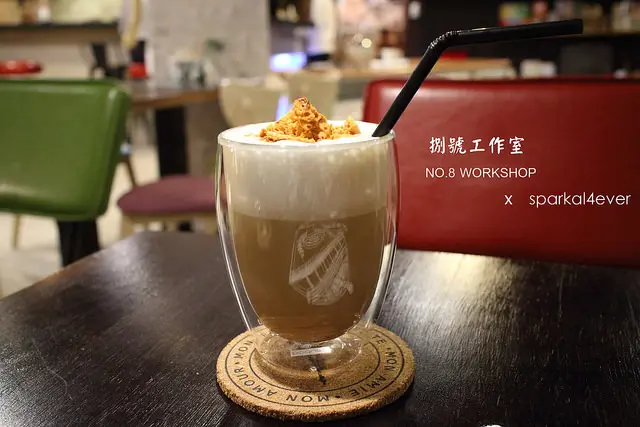 好奇詢問如何做的,原來是麥芽糖加上蘇打粉,在煮的過程中會澎起來,然後就變成我吃到的口感,焦糖的褐色外表,脆而有空氣的蓬鬆感,配上拿鐵增添層次,拿鐵順滑,咖啡味道淡雅。而這款僅能做冰的。