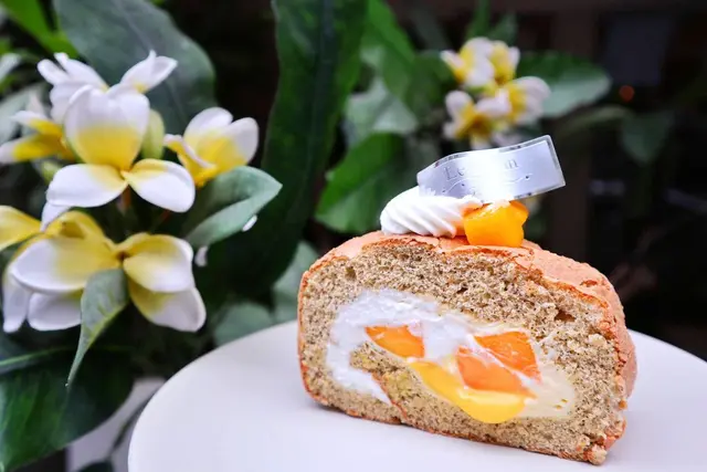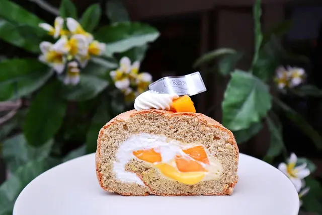 蛋糕捲裏起百香芒果餡與日本鮮奶油內餡整體很滑順香甜,芒果使用愛文芒果甜度超高,外皮不似紮實的虎皮蛋糕,是很Q軟鬆口又有薄薄的蛋白霜,非常討喜,茶香也很明顯。