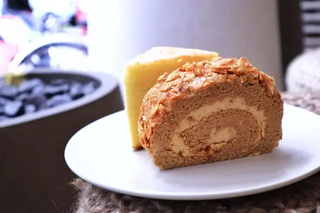 蛋糕捲咖啡味很濃郁但是又帶點微苦味,內餡奶油很滑順不會很膩口,裏著的焦糖核桃碎片和焦糖杏仁片增添口感,喜歡喝咖啡的朋友一定很愛這款蛋糕