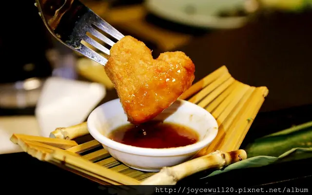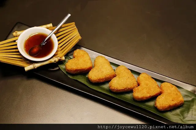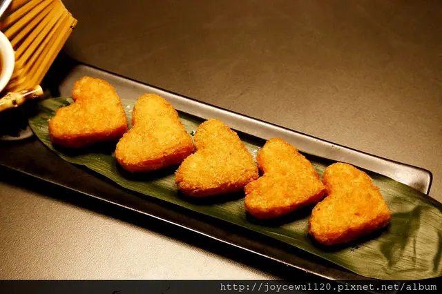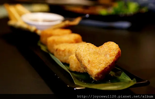 一上桌就讓大家眼睛發亮,金錢蝦餅大多都是原扁像飛碟的造型,泰集做成可愛的愛心完全吸引目光呀
