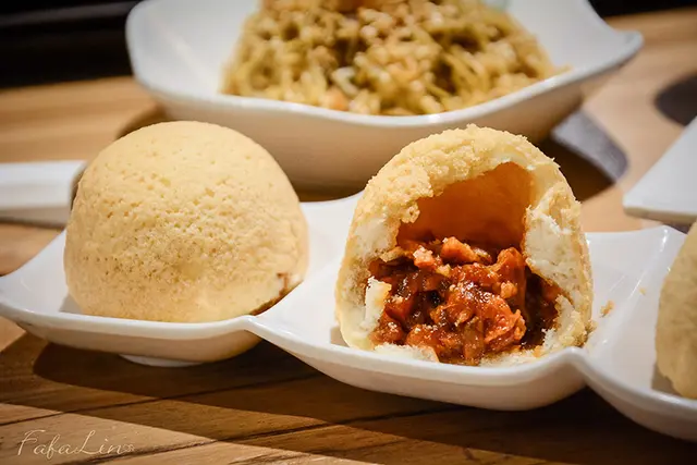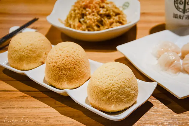 三顆渾圓叉燒包外表坑坑疤疤很獨特,咬下去是酥鬆脆皮,那細微脆感吃起來真的很微妙,有點像糖霜口感在舌頭上滾動著,非常細緻,風味如同菠蘿麵包帶點甜香氣味,吃過一次便喜歡上。