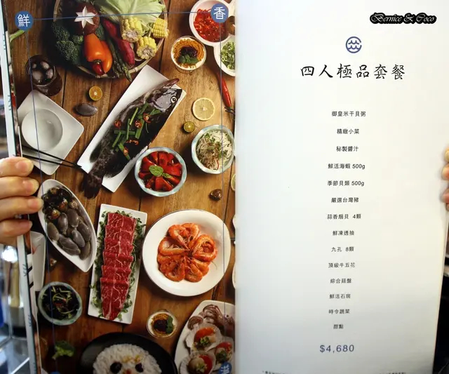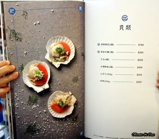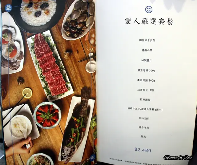 御皇米干貝粥、精緻小菜、秘製醬汁、鮮活海鮮300g、季節貝類300g、蒜香扇貝2顆