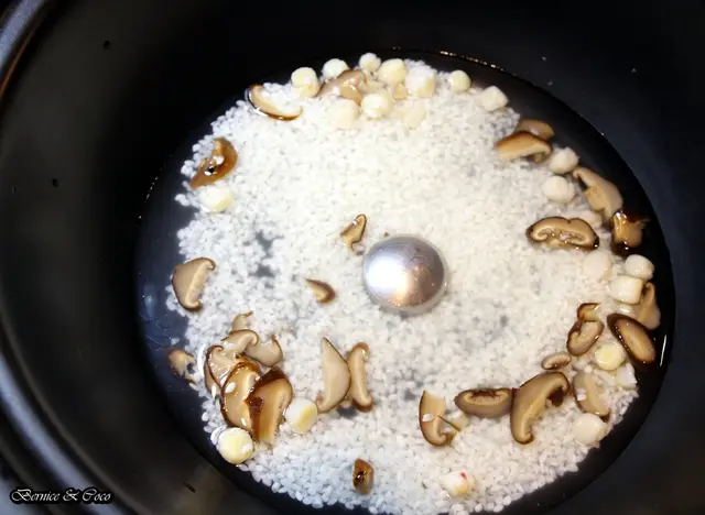 圓渾飽滿的小珠貝、香菇加上花蓮的御皇米先下鍋熬煮