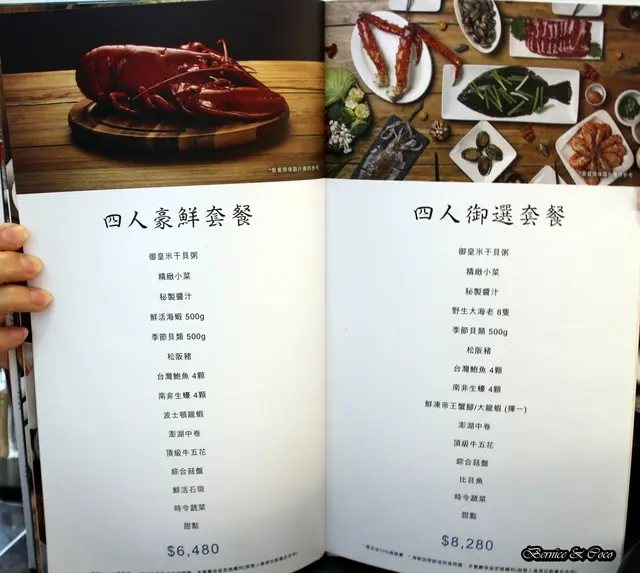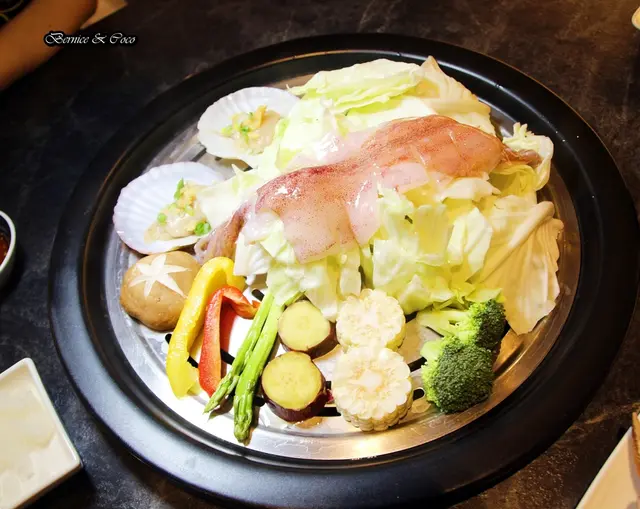 鮮凍透抽、頂級牛五花/鹽選台灣豬(擇一)、時令蔬菜、時令活魚、甜點
