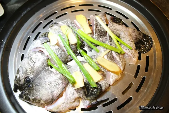 新鮮的龍虎斑用薑和蔥覆蓋後蒸煮