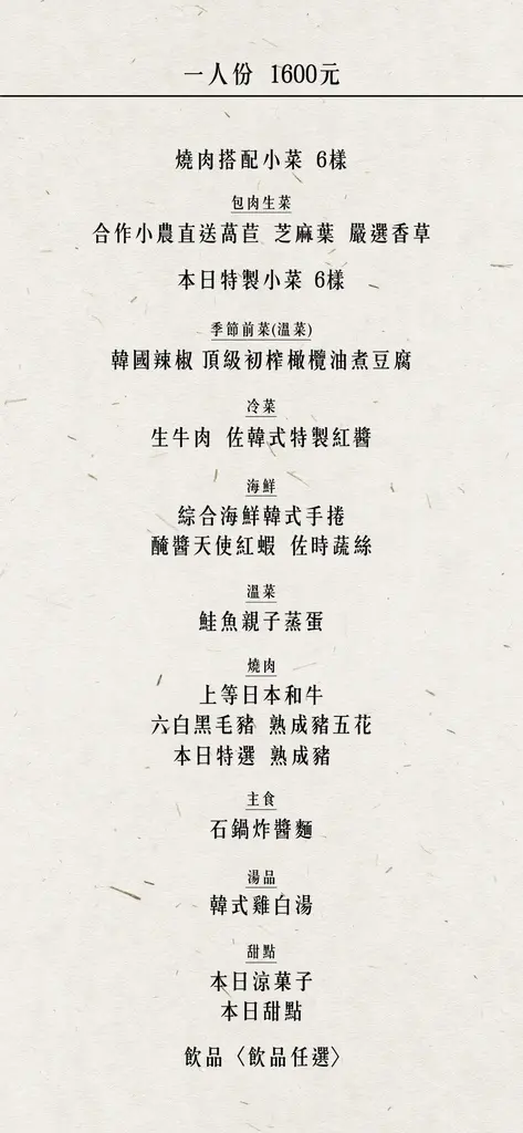 餐點屬於套餐製,一人份為1600元,不單單只有韓式燒肉,還搭配了日式的創意料理,仔細看下來真的很彭湃