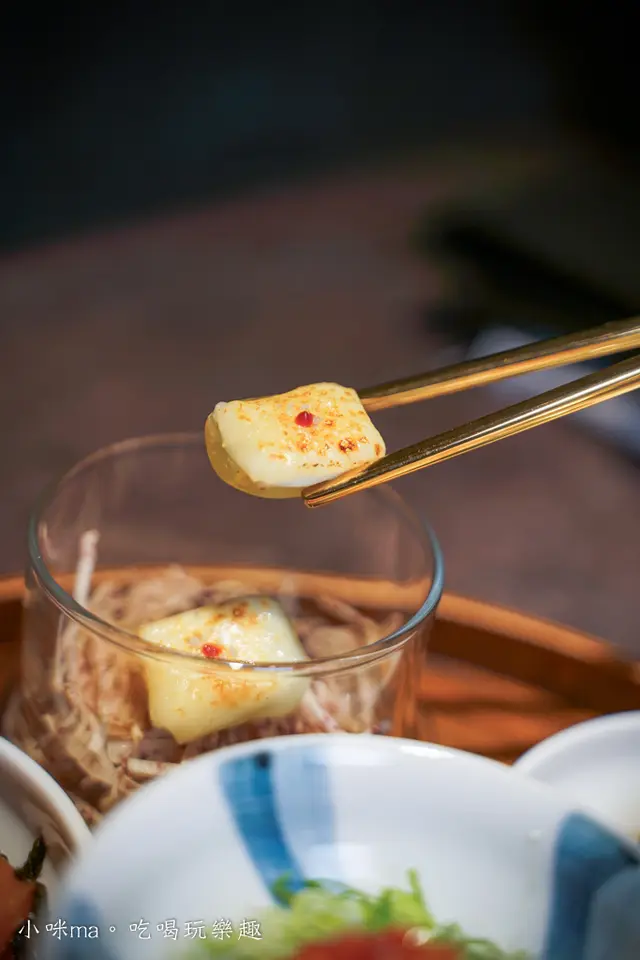 打開後你可以聞到淡淡的櫻花香氣,原來這一道料理用了櫻花木下去煙燻,底下是酥炸過的芋頭絲,上面的竟然是無籽葡萄搭配起司