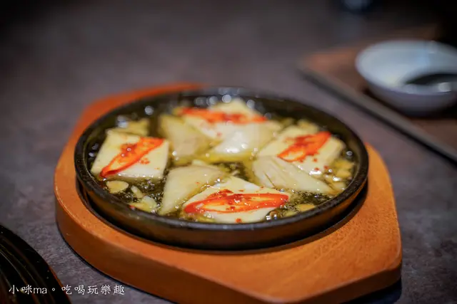 菜單上絕大部分的餐點都是桌邊服務、現場料理,這道用了杏鮑菇、嫩豆腐、韓國辣醬、辣椒、蒜頭下去用頂級初榨橄欖油燉煮