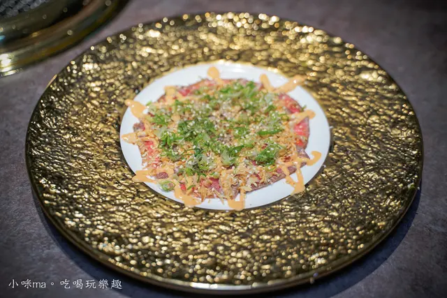 這一盤金光閃閃,底下的薄片用生和牛肉鋪底,淋上韓式味噌醬跟辣椒醬調和的特製紅醬,最後撒上蔥花跟油蔥酥