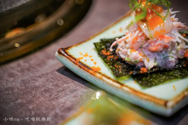 雖然名稱是韓式手卷,但我覺得它比較偏日本料理的等級,海苔包著自製海鮮餅、干貝、蟹肉、魚卵、飛魚卵....整個鮮味滿滿