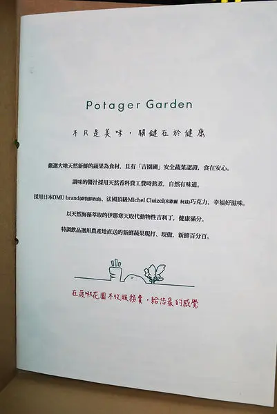 菜單裡的第一頁先是介紹了店裡的特色,強調食材都是使用天然無人工添加,且有「吉園圃」的安全蔬菜認證,這在大家對食安問題重視的時候,讓消費者安心。