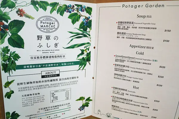 比較特別的是這裡有賣大瓶裝的「不思議野草水」,一瓶單價120元並不便宜,裡面是用十餘種野生植物,萃取出適合人體吸收的曠物質和純水混合而成,因為店裡不提供白開水,若是要喝可自備或是在店裡買野草水來喝。
