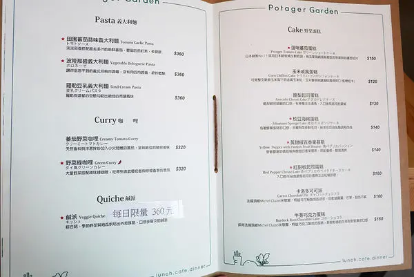 菠啾花園最大的特色,就是以天然野菜入菜,供應的料理有義大利麵、咖哩 及鹹派等各式蔬食餐點,多為五辛素,搭配台灣在地時蔬,為消費煮的健康把關。