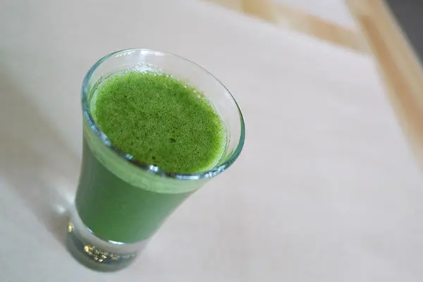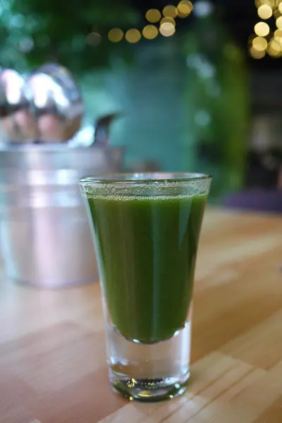 再送上另一杯品嚐杯叫做「蜜多綠」,它的顏色較淡綠色,是用綠苦瓜、香蕉、蘋果打成的果汁,雖然用了綠苦瓜,但喝起來卻沒有苦味,比例調合的剛剛好。