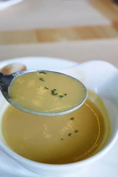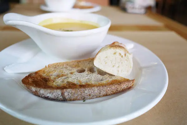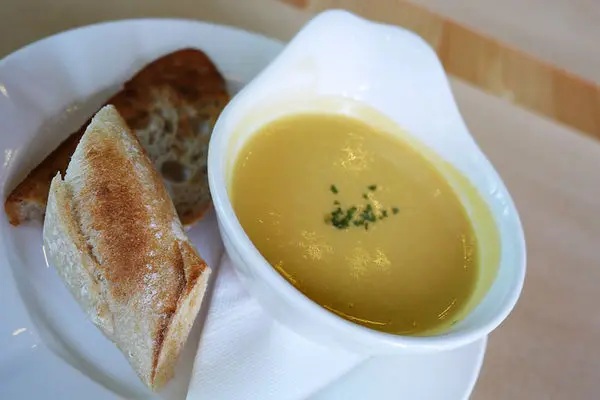 接著送上湯和麵包,湯是南瓜濃湯,喝起來沙沙的口感,感覺上是南瓜的料多於水,雖是濃湯但不油膩,紮實的一道美味湯品。