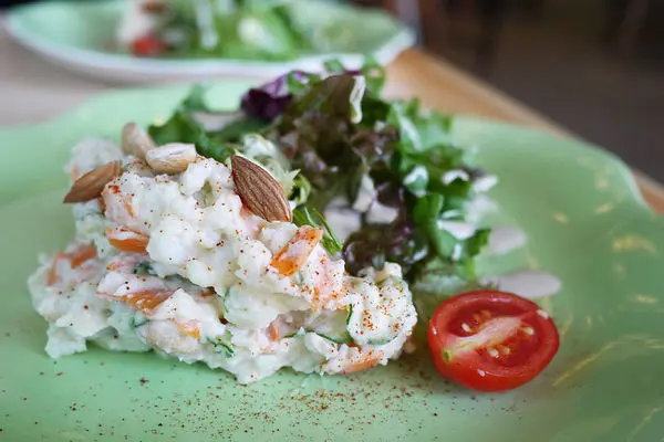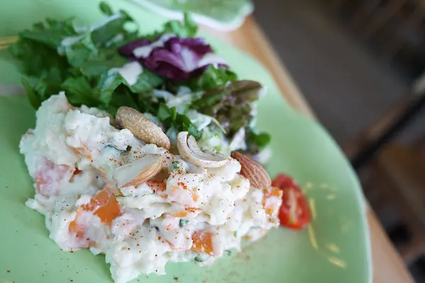 前菜一共有三道,頭一道是堅果馬鈴薯沙拉,使用新鮮的馬鈴薯加上烘焙堅果,在佐以法國有機芥花籽特調的美乃滋做成的,除此之外也加入了紅蘿蔔和蕃茄,旁邊再配上生菜沙拉,讓食物的整體看起來顏色豐富美味。
