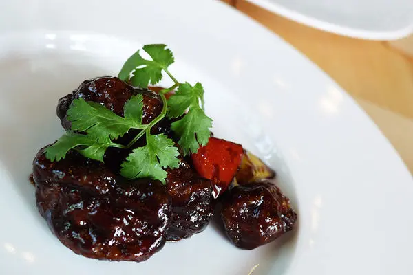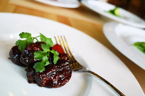 前面二道前菜都是冷菜,第三道是糖醋里肌,雖然名稱是常用的葷食菜名,但它卻是用日本進口的非基因改造大豆製成的,以巴薩米克酒醋燴成,吃起來的口感像極了菇類,而巴薩米克酒醋的調味屬略酸的口感,是法國料理中常見的調味料,店裡同樣有賣,而且不貴,若不是下個行程要去採購民生用品,否則應該買一瓶回家,用在自家料理也不錯。