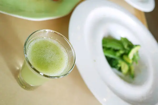入座後先送上品嚐杯,它有個很美的名字,叫「紗之夢綠」,裡面是用地瓜葉、鳯梨、蘋果、蜂蜜打成的果汁,喝起來沙沙的但完全沒有蔬菜的青草味,多的是水果自然甘甜的滋味,個人蠻喜歡這個味道的,感覺每天來上一杯會精力充沛。