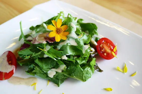 鹹派旁附一些生菜沙拉,特別的是上面有一朵小黃花,是可以食用的,吃起來就像是菊科類的花朵,還蠻能接受的。