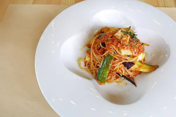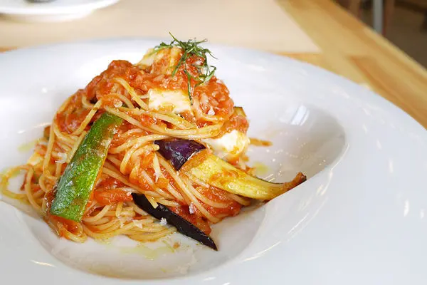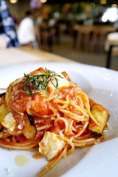 田園蕃茄蒜味義大利麵,用淡淡蒜香提出香氣,搭配新鮮蕃茄、櫛瓜、茄子等蔬食,蕃茄內富含茄紅素及豐富維他命B6、C、E、鉀、葉酸,是許多義大利料理和各國料理不可或缺的食材。