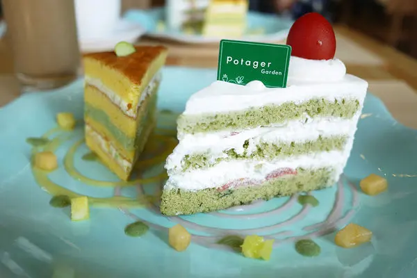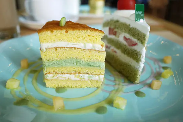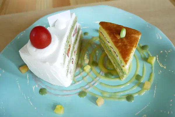 而另一款叫枝豆海綿蛋糕,上頭用半顆毛豆來裝飾,夾層用毛豆泥、抹茶及奶油乳酪,這款蛋糕吃起來口感綿密而有彈性,像極了千層蛋糕,加上鮮奶油用量較少,起司的味道又較濃郁,深獲我個人的喜愛。