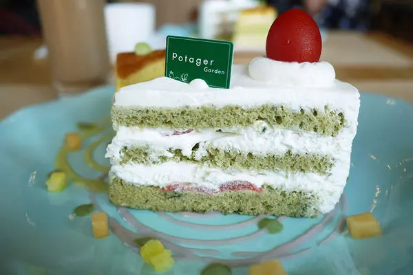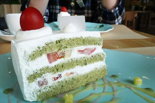 蕃茄蛋糕綠色的蛋糕體部份是用地瓜葉做的,蕃茄除了最上層整顆做裝飾外,夾層中也有切丁的蕃茄,這款蛋糕體吃起來鬆軟,口感也特別,鮮奶油吃起來清爽無負擔,我們都喜歡。