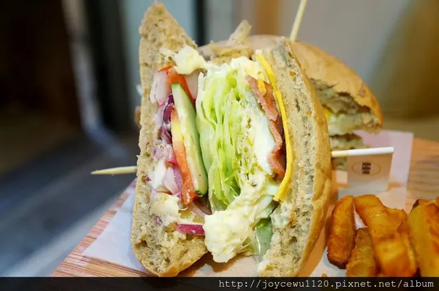 這款是大巧巴達麵包,夾層美生菜 番茄 洋蔥 苜蓿芽 培根 蛋沙拉 美國起司
