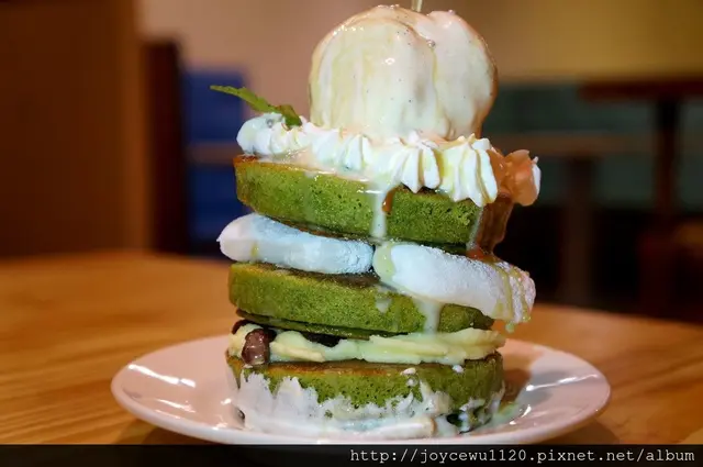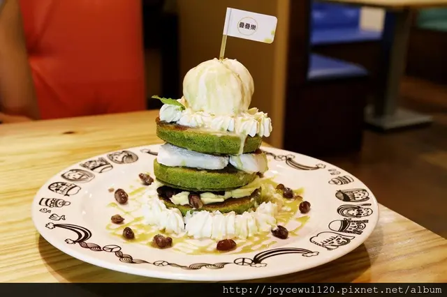抹茶口味的鬆餅,搭配焦糖 麻糬 紅豆 鮮奶油 卡士達醬,以及莫凡彼香草冰淇淋