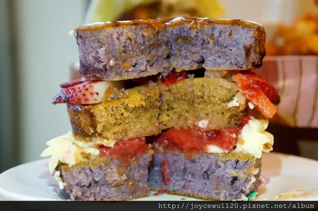 溫暖厚實綿密的鬆餅,搭配酸甜草莓餡,甜而不膩! 帶著淡淡的巧克力與莓果香氣! 好好吃唷
