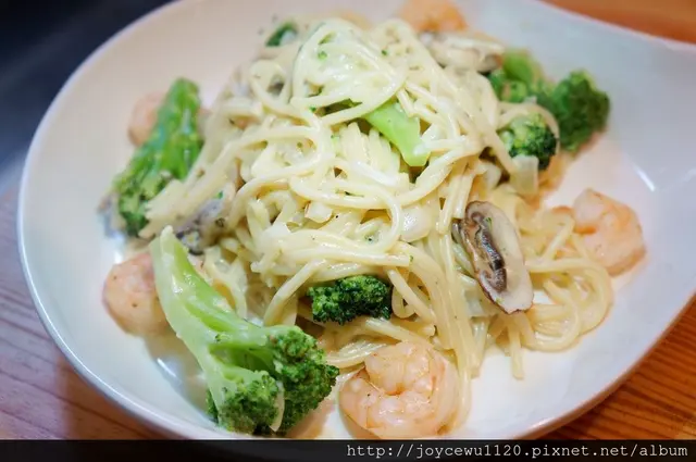 白醬用量較少,使麵的味道不是那麼濃郁,而配料的蝦仁和蘑菇因為較少白醬拌炒的關係
