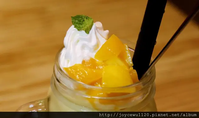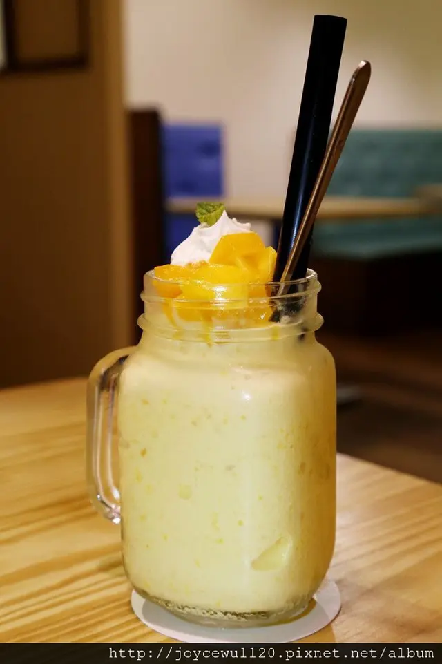 用新鮮芒果打成的冰沙,喝起來酸甜偏甜! 還可以吃到細微的果肉在裡頭呢~