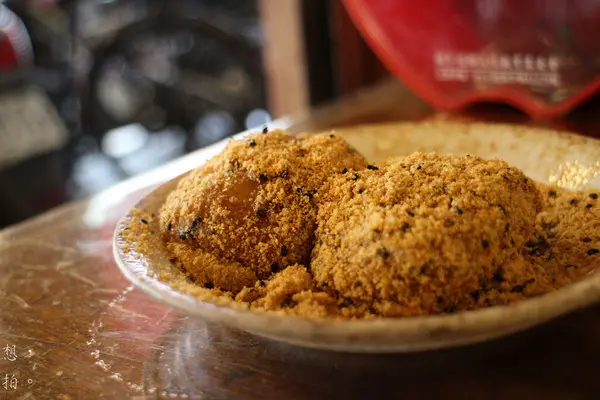 熱麻糬從黑糖水脫身後,要在旁邊的花生芝麻粉翻滾個兩三圈,然後...