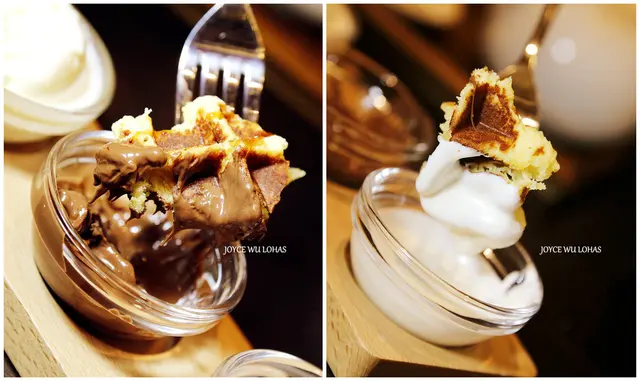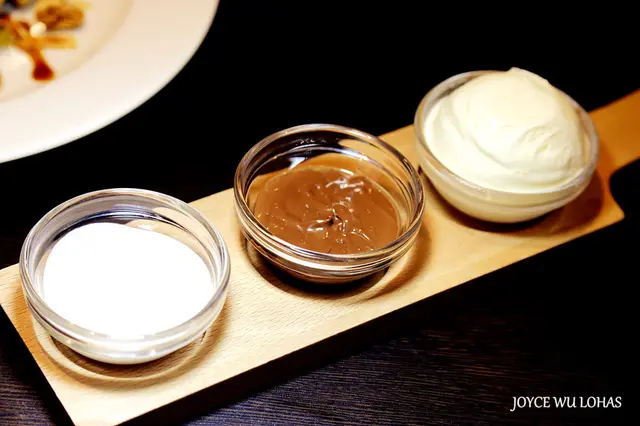 同樣附上拼盤醬料可以搭配,包含香草冰淇淋、紅櫻桃醬、香草卡士達等吃起來更豐富、多變