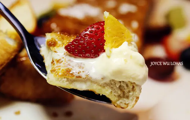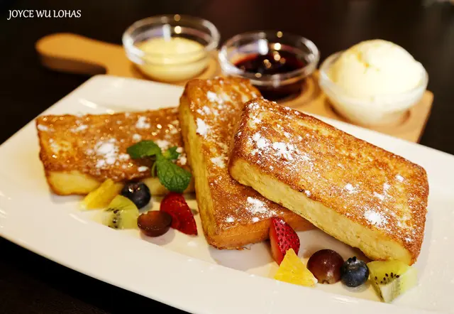 法式吐司加上牛奶糖漿炙燒,新鮮水果草莓、葡萄、奇異果丁點綴,馬上溫熱上桌!