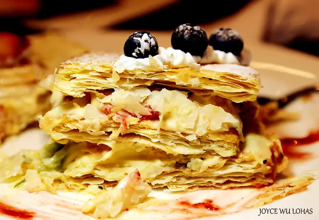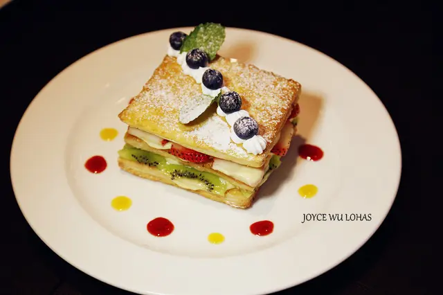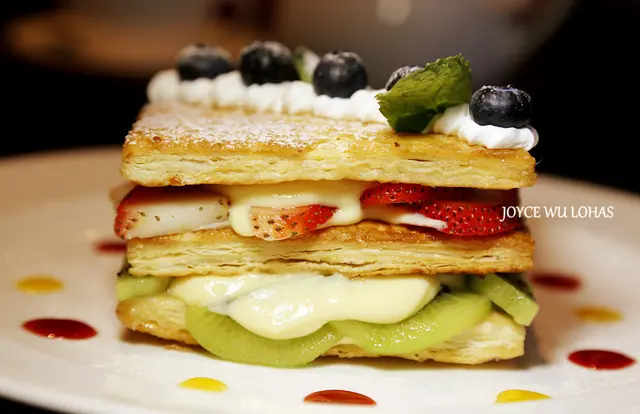千層餅吃起來有些像那種蝴蝶酥的感覺,三片夾層卡士達餡、草莓、奇異果、藍莓等
