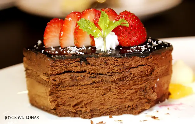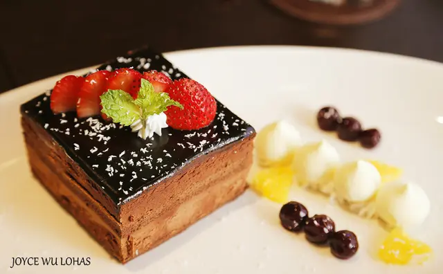 苦甜偏苦的生巧克力,紮實中又入口即化! 搭配一旁酒漬黑櫻桃可以增加味覺上的細膩與層次感