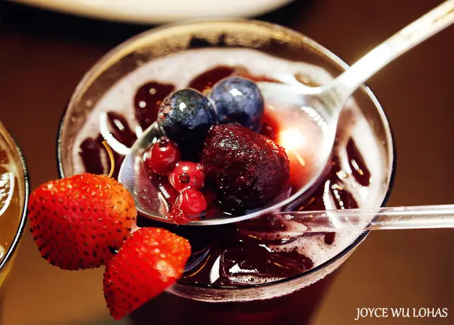 這裡的冰飲不但給的大杯,裏面豐富的新鮮水果完全不手軟呢!蘋果、奇異果、草莓...等,更讓我驚訝的是吃到一顆顆新鮮藍莓、紅莓
