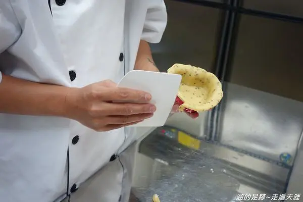 師傅好厲害,一下就做好一個愛心派的餅皮,甜派的餅皮裡面紅紅一點點的原來是紅藜麥。