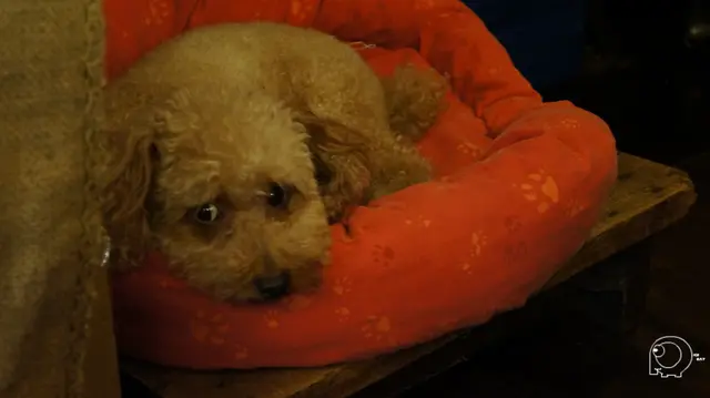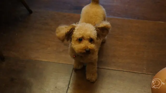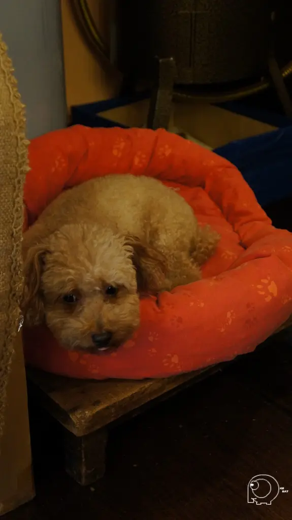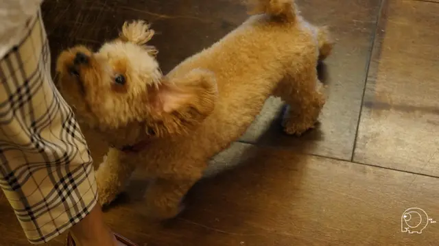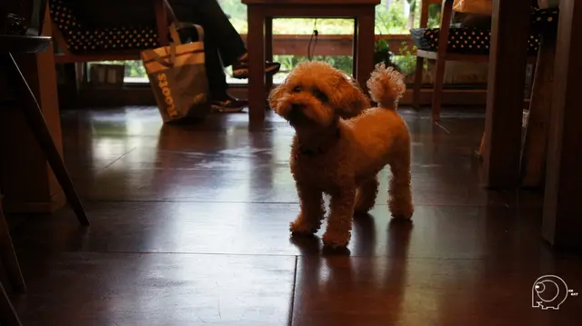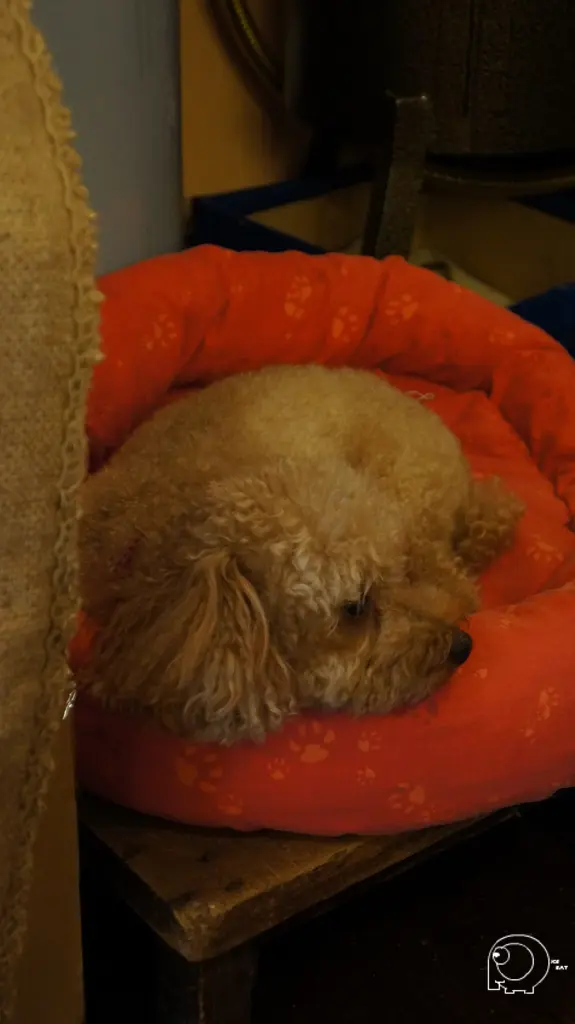 接下來會聽到狗狗的歡迎聲,如果你不是怕狗人士的話~你會覺得店狗好好笑喔,因為只有有人進店哩,牠就會從小窩衝出來,然後一直叫,老闆說是在通知他們有客人來了,紅貴賓長很可愛,所以想要摸牠,可是牠就一邊叫一邊後退.如果沒有客人來,牠就窩在牠的小窩哩,這時美姬想去跟牠玩,結果牠就作勢要咬人,老闆說人大狗小,所以牠怕被抱走,所以要裝凶狠~嗯!美姬有嚇到,但是後來店狗的行為實在是太好笑了,就讓我們繼續看下去