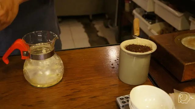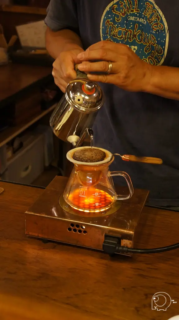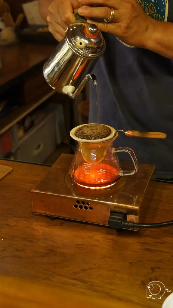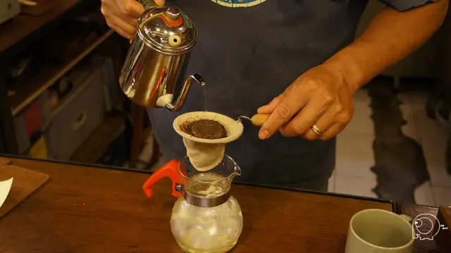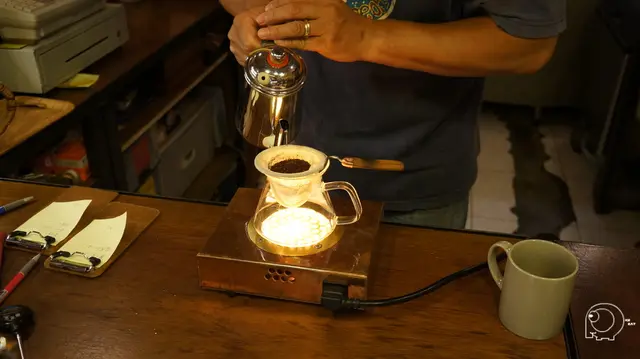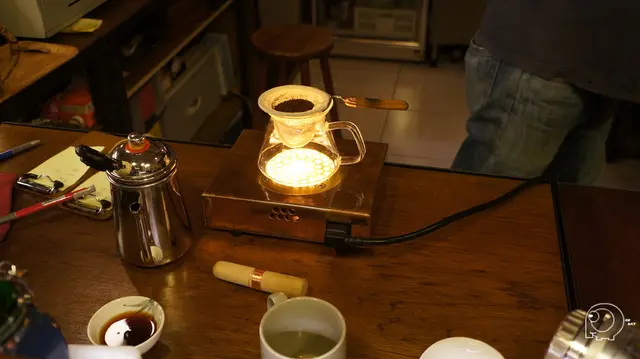 接下來換美姬的熱咖啡囉.為了讓咖啡滴下時不要遇到溫度較低的咖啡杯,一般的咖啡店都會溫杯,但是老闆的家私可是更高級的喔,在咖啡壺下面是加熱器,為了讓大家可以喝到好咖啡,到處都可以發現老闆的用心.不知道是不是因為美姬剛剛有跟老闆說"法蘭絨"的關係,美姬的熱咖啡也是用法蘭絨沖泡喔